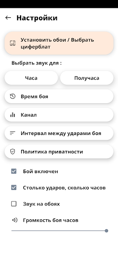 По умолчанию интервал боя 9:00-17:00, звуковой канал - мультимедиа. Эти и другие параметры можно сменить в самом приложении.