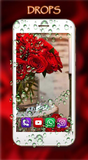В приложении Розы Галерея Живые Обои реализован реалистичный эффект капель воды на стекле. Реалистичные капли росы на экране раскиданы по поверхности стекла. Интерактивное касание пальцем вызывает изменение направления.