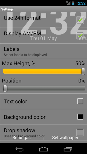 Простые живые обои с часами, числом, днём недели, именем WiFi сети, ближайшим будильником и зарядом батареи. Фоновое изображение также настраивается. Минимальное потребление памяти и заряда аккумулятора.