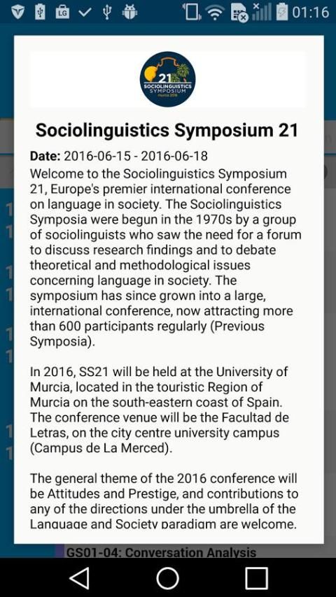 Добро пожаловать в мобильное приложение социолингвистики симпозиума 21, премьер международной конференции по проблемам языка в обществе. 21-социологическое Симпозиум будет проходить 15-18 июня 2016 года, в Университете Мурсии, Испания. Общая тема конференции 2016 года будет отношение и Prestige. В дополнение к этой основной тенденции, также будет вклад в любом из направлений, в пределах спектра языка и парадигмы общества: Социология языка, Социальная психология языка, Дискурс анализ, анализ Разговор, этнография общения, языка и пола, Антропологические лингвистика, язык средств массовой информации, социально-стилистика, Variationist социолингвистика, диалектология, Geolinguistics, Исторические социолингвистика, креольские социолингвистика, когнитивная социолингвистика, Прикладная социолингвистика, Социолингвистические методы и т.д.