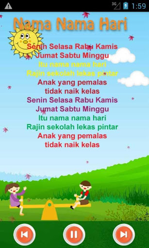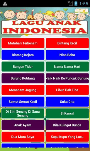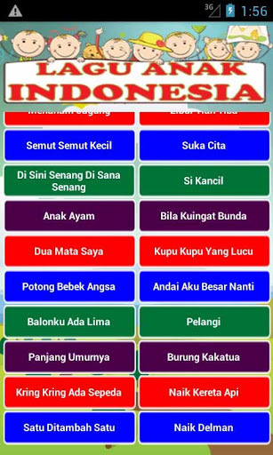 Kumpulan lagu anak anak Indonesia lengkap berisi berbagai jenis lagu untuk anak Indonesia popular sepanjang masa berupa mp3 offline dilengkapi dengan lirik serta animasi yang tidak membuat bosan. Aplikasi lagu anak anak semacam ini merupakan salah satu sarana untuk mendidik anak karena tema tema lagu yang edukatif untuk membentuk karakter anak sejak usia dini terutama usia anak TK dan PAUD.