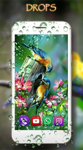 Приложение Любовь Птицы Живые Обои содержит интерактивный эффект капель воды на стекле . Капли воды на стекле телефона разбросаны в случайном порядке. При прикосновении капли росы меняют траекторию движения.