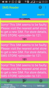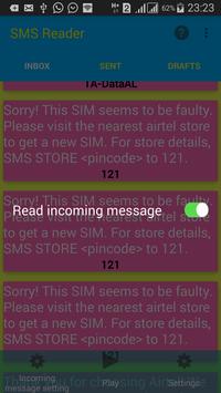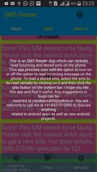 This is an SMS reader app which enables the device to read out the incoming as well as stored SMS on the device.The app gives the user the option to turn on or off the reading of incoming SMS. To listen to text in SMS verbally, the user has to click on the SMS which is to be read and click on the play button.