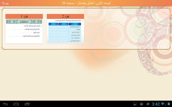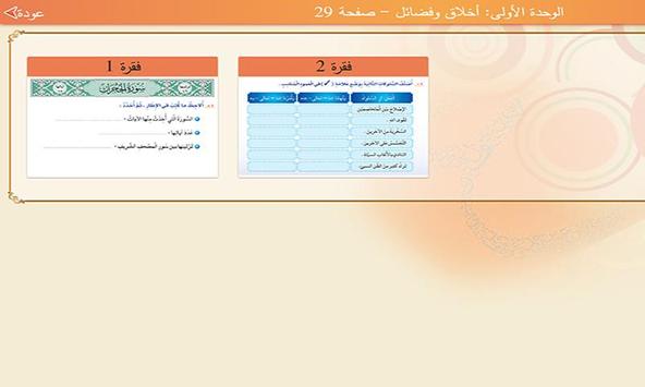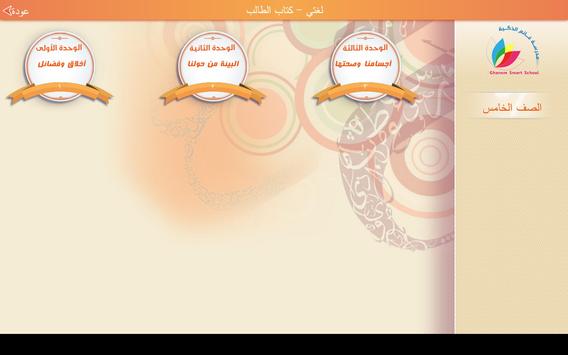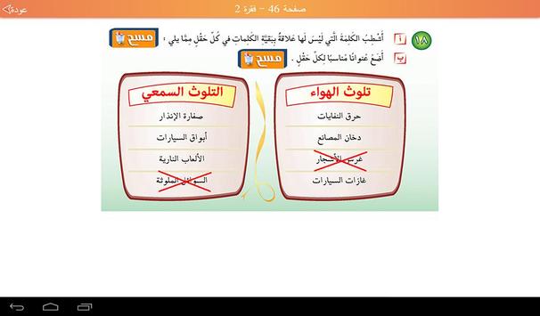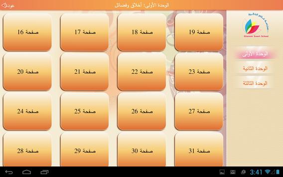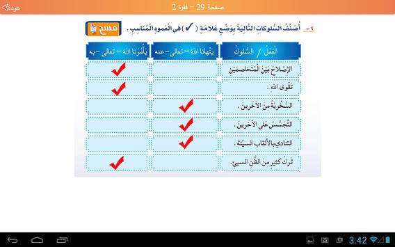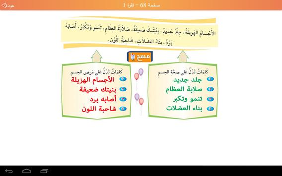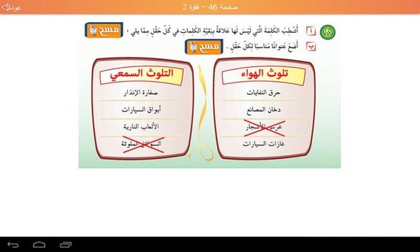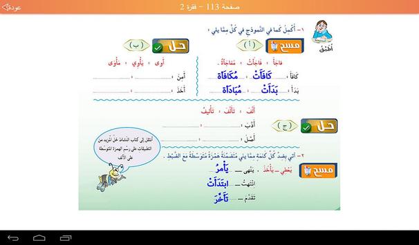 يختار الطالب الوحدة ثم يختار رقم الصفحة فيتم عرض فقرات الصفحة وباختيار الفقرة تظهر الفقرة في صفحة لوحدها بحيث يركز عليها الطالب مع أزار الحل والمسح والتي تتيح للطالب حل التمرين ومسحه لكي يقوم هو بالحل.