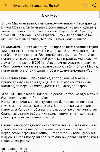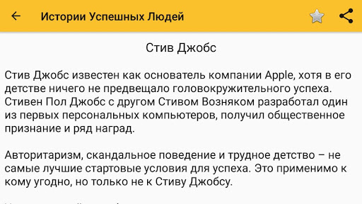 На страницах этого приложение вы найдете самые увлекательные биографии самых известных людей нашей планеты. Их достижения 🏆 и провалы 😱. У Вас появится возможность узнать путь самых успешных людей 😍 и понять что повлияло на жизненные взгляды, подчеркнуть причины успеха, саморазвития и мотивации победителей 🥇