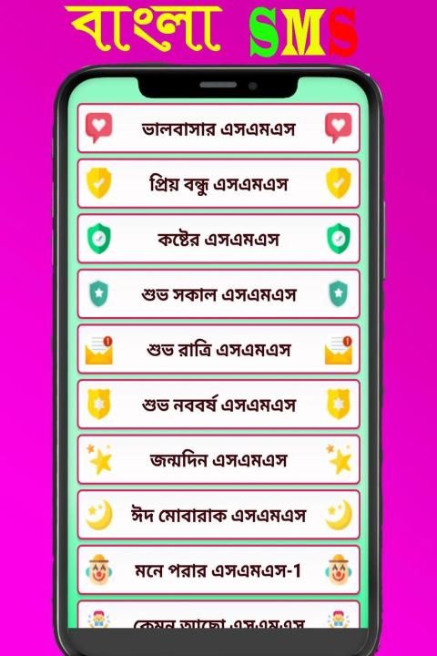 / Love sms = Valobasar sms / Love sms / Advice sms = Upodesh sms / Sms of distress = Koster sms / Friend sms = Bondur sms / Friend sms / Mother sms / Friend sms = Ma = Babar sms / Good wishes = Shuvo Kamonar sms /