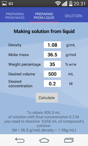 4.) Concentration calculator can be very useful tool for laboratory work and for basic calculations in chemistry - making solutions from solids or liquids and dilution.