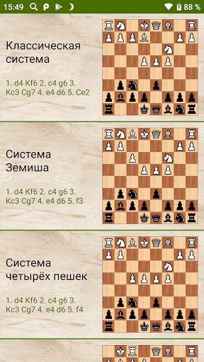 Головоломки разделены на 4 группы по основным вариантам такого популярного дебюта, как Староиндийская защита. Во всех партиях данного приложения победу одерживали шахматисты, игравшие чёрными фигурами.