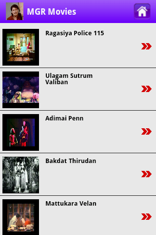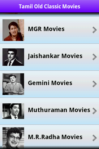 Watch high quality Tamil Old Movies on your mobile device. This application will play your Favorite Tamil Old movies in 2G, 3G, 4G and wifi networks.Category of Tamil Old Movies-----------------------------1. Sivaji Movies2. MGR Movies3. Jaishankar Movies4. Gemini Movies5. Muthuraman Movies6. M.R.radha Movies7. Nagesh Movies8. Chandra babu Movies9. N. S. Krishnan Movies10. Ravichandran Movies11. Other Moviesand etc.Don't forget to provide your valuable feedback, comments and ratings :-)DISCLAIMER:All video's listed in this application is hosted by youtube All these videos are publicly available on YouTube and uploaded by other YouTube usersand We do not manage or upload any video. Hence we do not have access to remove the video.It is just an organized platform to browse and watch the YouTube videos.