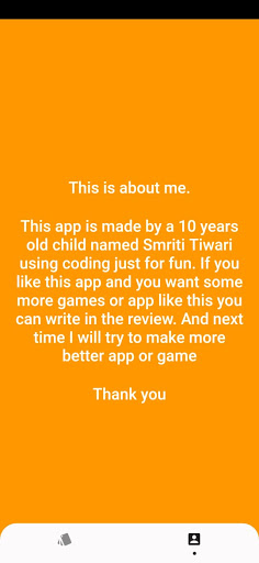 This app is made by a 10 years old child named Smriti Tiwari using coding just for fun. If you like this app and you want some more games or app like this you can write in the review. And next time I will try to make more better app or game
