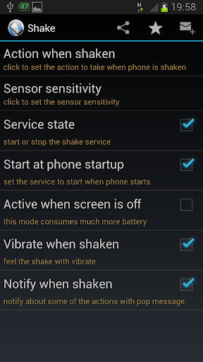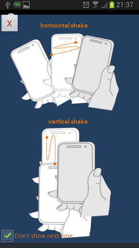 Bu uygulama, çeşitli işlemleri tetiklemek için telefonunuzu sallamanızı sağlar! Ekranınız kapalıysa bile, hala sallayabilirsin ve işe yarayacak!