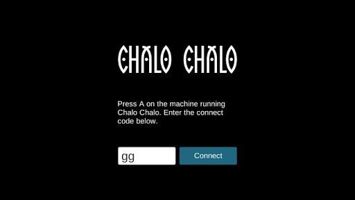 Make sure that the desktop machine that Chalo Chalo will run on is connected to the same WiFi network as the phone that you will use as a controller. Launch a game of Chalo Chalo on your desktop machine. Open the Chalo Chalo WiFi Controller app on your phone. Most phones will automatically detect the running Chalo Chalo game and bring you to a screen with a 'Join Game' button within a second or two. Some phones won't connect automatically. To manually connect, press A on the Desktop Machine to display a connect code on screen (press A again to hide the code). Enter that connect code into the input field on your mobile device, click the Connect button.