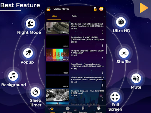 Video Oynatıcı - Magic Media Player Play HD videoları en iyi yüzer video oynatıcı ve yüksek resim kalitesinden ve en iyi ekipmanlardan biridir. Video Oynatıcı - Magic Media Player, AVI, MP4, WMV, RMVB, MKV, 3GP, M4V, MOV, MPG, FLV vb. Dahil tüm video formatlarını destekler. Şimdi HD videolar, SD videolarını izlemek çok kolaydır. Full HD video oynatıcı tüm Android mobil cihazları destekler. Her cihazda sorunsuz çalışır ve izleyicilere inanılmaz bir izleme deneyimi sağlar. Video oynatıcı - Magic Media Player, android cihazınızda yüksek kalitede veya ses çıkarır, ekolayzır ile çaba sarf etmenize yardımcı olur.