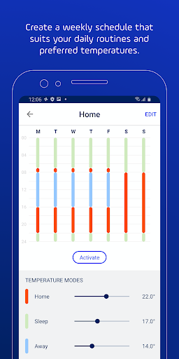 ⦁ Uygulamada sıcaklıkları ayarlayın ve ayarlayın. Evdeyken sıcaklıkları otomatik olarak ayarlamak için haftanın bireysel planlamasını ayarlayın ( Comfort Sıcaklık.) - Geceleri (uyku sıcaklığı.) Ve uzakta (işte ya da tatilde)