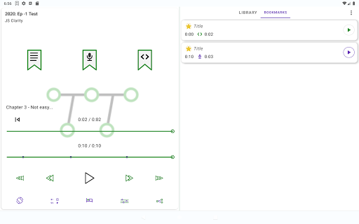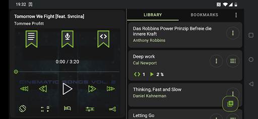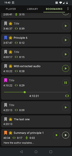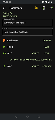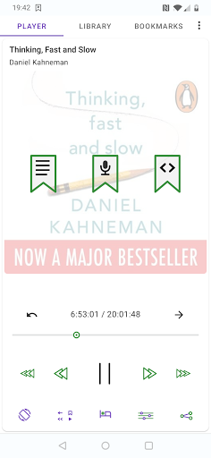 AudioBook Player, sesli kitaplar dinlerken sesli notlar, metin notları ve aralık yer imlerini almanıza olanak sağlar. Uygulamanın amacı, yer imlerini ve fikirleri kaydetmenin en uygun yollarını sunmaktır, böylece onları daha sonra gözden geçirebilirsiniz.