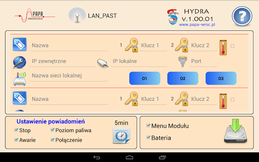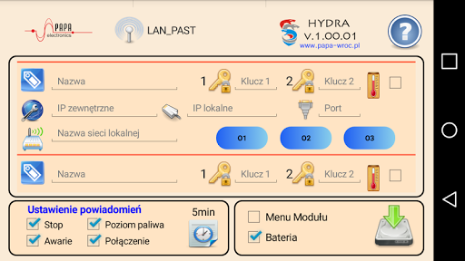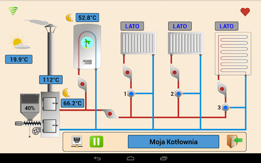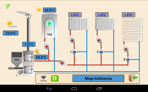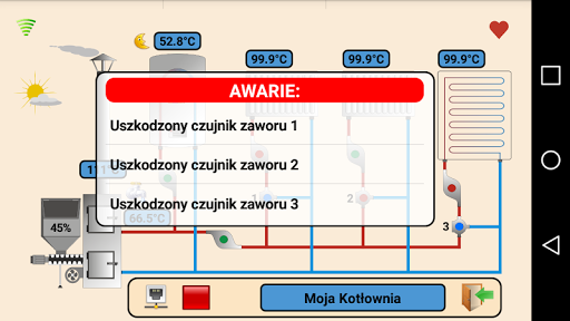 - wysyłanie powiadomień do systemu Android o zdefiniowanych wcześniej zdarzeniach (niski poziom paliwa, awarie, stan "STOP" kotła, utrata łączności),