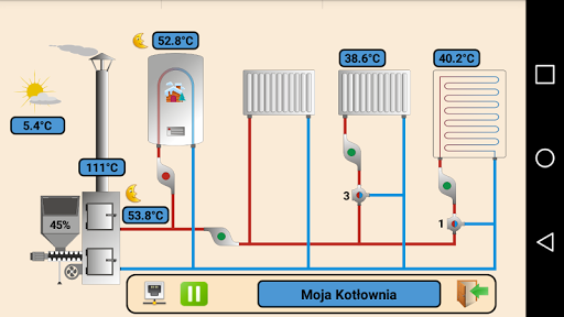 - wizualizacja stanu kotłowni i temperatur w poszczególnych obiegów grzewczych,