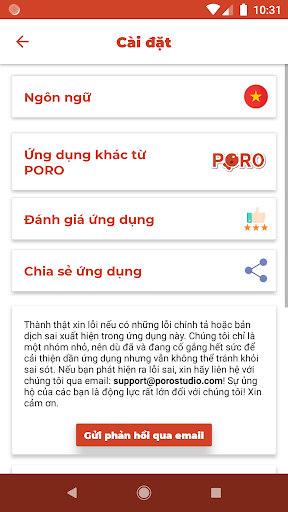 Ứng dụng "Học Tiếng Bồ Đào Nha - Luyện Nghe Nói" vẫn còn đang trong quá trình phát triển, nên chúng tôi rất hy vọng nhận được các bình luận đóng góp ý kiến của các bạn để có thể hoàn thiện hơn. Chúng tôi là một đội ngũ yêu thích tiếng Bồ Đào Nha và luôn cố gắng chia sẻ tình yêu này đến với cộng đồng, vì vậy nếu bạn yêu thích ứng dụng thì hãy bỏ ra một ít thời gian để đánh giá 5 sao nhé! Bạn cũng có thể liên hệ với chúng tôi bằng cách bình luận hoặc nhấn phản hồi trên màn hình tùy chỉnh.