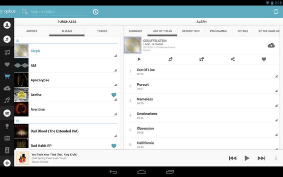 The Qobuz app for Android smartphones and tablets enables you to enjoy your Purchases and Hi-Fi subscription in CD Quality, even when you are on the go and not connected.