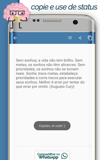 App com frases feitas para ler, refletir e compartilhar com seus amigos, grupos e família, use como mensagens de bom dia, boa tarde ou boa noite, também servem como status no face, insta e whatsapp. Você também pode user de legendas das suas fotos. Adultos inteligentes gostam de ler como passatempo, e nada melhor do que ler palavras sábias e edificar o seu conhecimento com a sabedoria desses verdadeiros gênios como o famoso Chico Xavier! Até mesmo frases curtas tem a capacidade de tocar o nosso coração, nos motivar no dia a dia e nos trazer conhecimento.
