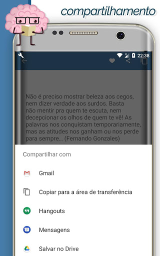 Compartilhar: botão de compartilhamento rápido pelo WhatsApp e também compartilhamento em outros apps do Android, como Facebook, Instagram, tumblr, sms, email, etc...
