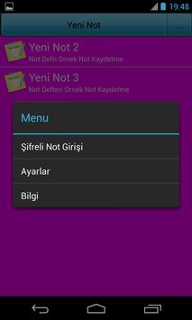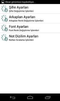 Ayarlar Menüsüne Yeni Not butonunun yanındaki 3 noktalı butona tıklayarak yada cihazınızın menu tuşuna basarak ulaşabilir şifreli notlarınıza bu bölümden ulaşabilir ve şifrenizi değiştirerek, diğer özelliştirmelerinizi de yapabilirsiniz.