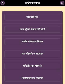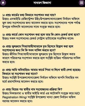 এই অ্যাপটিতে কিভাবে অনলাইনে এবং অফলাইনে আইডি কার্ডের জন্যে আবেদন করবেন, হারিয়ে গেলে কি করবেন, জাতীয় পরিচয়পত্রের কোথাও ভুল থাকলে সেটা কিভাবে সংশোধন করবেন এবং এর জন্যে কোথায় যেতে হবে; সবকিছুই অন্তর্ভুক্ত করা হয়েছে।