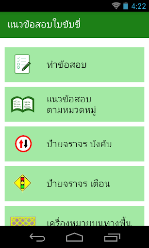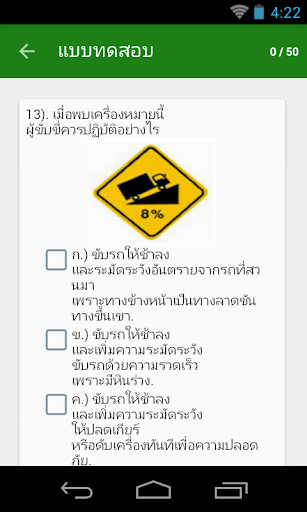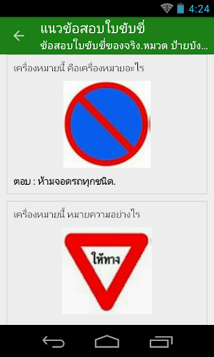 แอปพลิเคชัน ฝึกข้อสอบขับขี่ มีตัวอย่างข้อสอบมากมาย พร้อมคำอธิบายป้ายต่างๆ และมีแบบทดสอบโดยการสุ่มข้อสอบมาให้ทำ 50 ข้อ