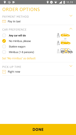 Paying for your ride is simple. You can choose to pay with cash or with payment card in a taxi or with registered paying card at the app. When you pay with the app your card is debited automatically, and receipts will arrive straight to your email, or even to your accountant if you use eTasku or Procountor service. You can register two different payment cards (for example company card and your personal card). Note that paying with app is not supported in all areas.