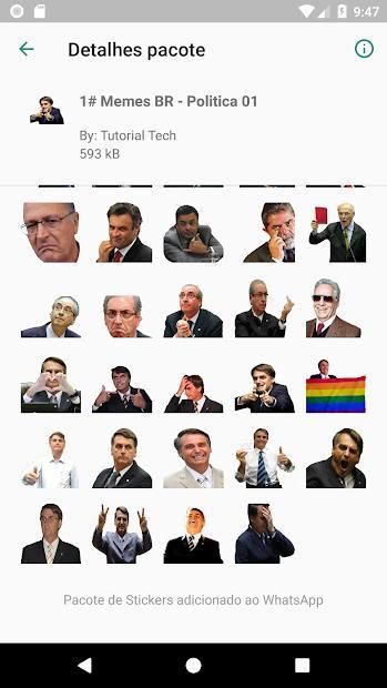 Pack com vários Stickes para WhatsApp, figurinhas no estilo de Memes Brasileiro, nessa versão está disponível pack de políticos ,Pepe Clássico e 300 memes aleatórios, em futuras versões virá novas Figurinhas, Aguarde!!!