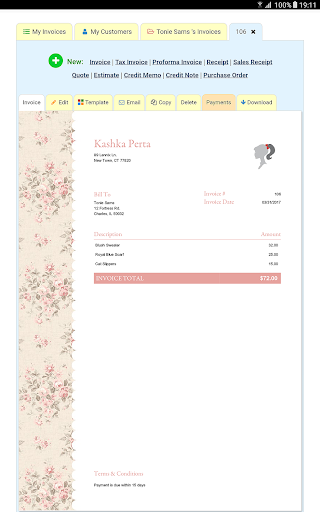 Your options aren’t just limited to invoices as you can create and send PDF estimates, quotes, receipts, proforma invoices, purchase orders and more all on one convenient invoice app.