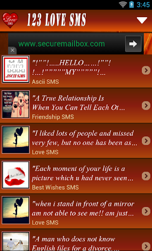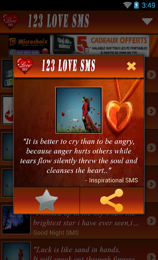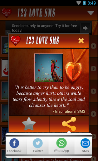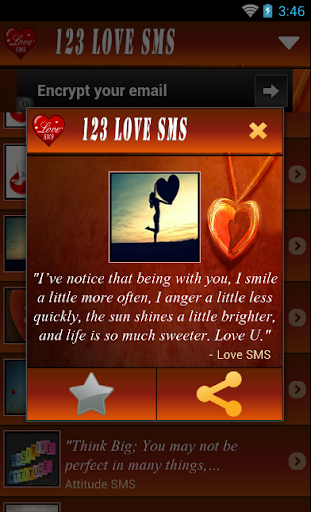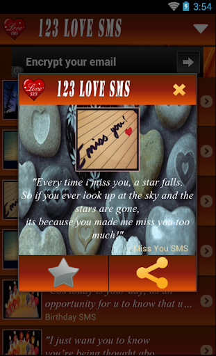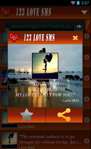 Is a nice android application. it contains collection of special love messages and Propose SMS for your LOVE. This application lets you browse love sms, mark them as favorite, send them through Facebook, Whatsapp, Email, etc.