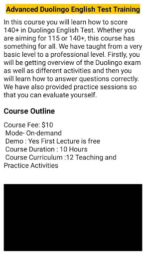 If you looking for advanced training on Duolingo English Test Training then this is the right platform you. Here you will learn how to score 140 in Duolingo English Test. Whether you are aiming for 115 or 140 , this course has something for all. We have taught from a very basic level to a professional level. Firstly, you will be getting overview of the Duolingo exam as well as different activities and then you will learn how to answer questions correctly. We have also provided practice sessions so that you can evaluate yourself.