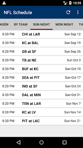 Easily browse through games week-by-week, or pick out your favorite NFL team's schedule or choose from Monday night football (MNF), Sunday night (SNF) or Thursday night (TNF) match-ups.