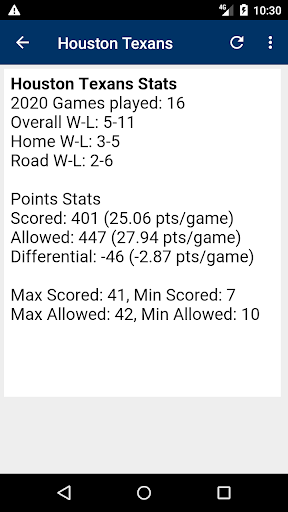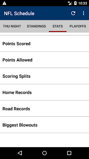 The stats section lists passing, rushing and receiving leaders - great for fantasy players. Quickly browse home team records, lopsided wins, shutouts and most points scored in a game this year. And team stats are included, plus more!