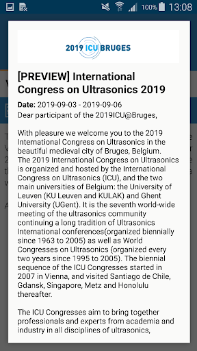 This is the official conference app of the 2019 International Congress on Ultrasonics (2019 ICU), which will be held in the beautiful medieval city of Bruges, Belgium, from September 3 to September 6, 2019.