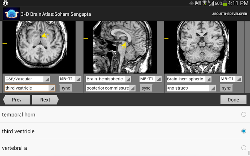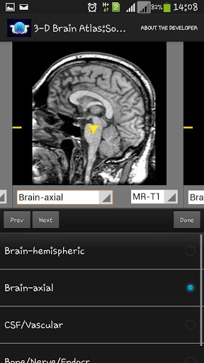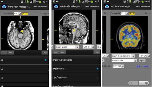 This application is a simple learning tool for Medical Professional who get a tri-axial view of human brain. This offers to provide the tap-to-scan a part of human brain and presents 3-D view of that portion. One can even search the different portions of brain, as well; and can rotate about any axis with 1 degree precision. This app will help Medical Professionals like those who pursue Neurosurgery, Neurology, Radiology et al, not only to get themselves acquainted about the major parts of brain without having to go for dissection; also they practice to read MRI reports. Acknowledgement: This application uses Brain database web service from Harvard University, and needs an active Internet connection to work.