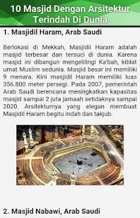 Dalam aplikasi gambar masjid cantik ini, kita akan dapat melihat ratusan masjid indah yang ada di dunia. Desain masjid indah dan megah di setiap negara memiliki gaya arsitektur masjid sendiri, karena rata-rata mengambil filosofi budaya setempat. Namun tanpa tetap tidak menghilangkan unsur Islamnya.