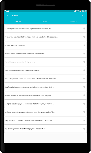 - This app is easy to use. Each categories divide in three tabs: Unread( display randomly what jokes you have not been read), Read (Jokes you have already read), Favorite (Jokes you like to read)