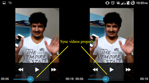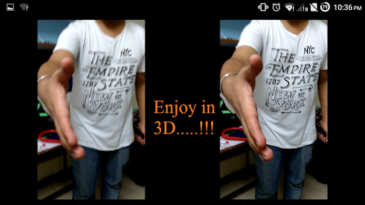 Keep two phones side by side and record something on both at the same time (device at left records the left video and device at right records right video) , now transfer 2 videos to one mobile, and use this app to select those 2 videos. Now play the video and use the seek bar to sync them properly, enjoy your video in 3d..................