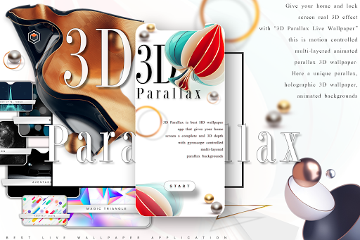 A beautiful app that gives a complete 3D experience to your home and lock screen, currently we have 500 live wallpaper and we are continuously updating our store.A Unique 3D Wallpapers HD & Holograms - Animated Parallax Backgrounds collection Give your home & lock screen a real 3D depth effect with this motion controlled multi-layered animated parallax 3D wallpaper.