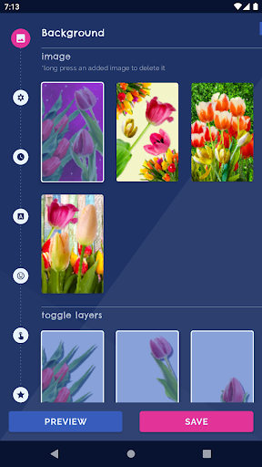 Create your own themes by adding clocks, frames, emoji, animated colorful tulips, magic touch to the background changer, or even make it a 3D wallpaper or 4D wallpaper (parallax wallpaper with parallax effect). It works on the lock screen too!