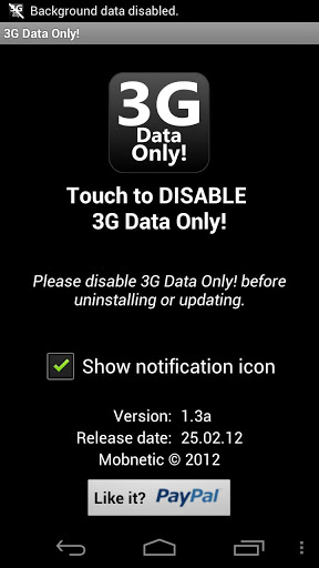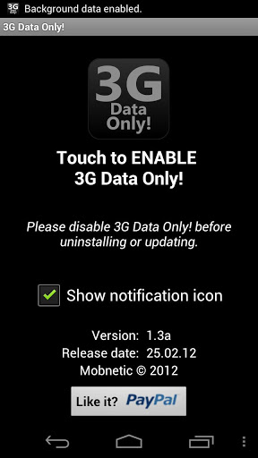 Allow to transfer data only when you are in the 3G network with quot;3G Data Onlyquot;Use this application to block background data over the 2G network.The background data will onlybe available when you are in range of the 3G network and higher.This app is not blocking the MMS APNWarning If you do not understand what this program is doing or you do not need this app please don39;t download it.Remember to DISABLE the 3G Data Only before uninstall.Please report any issues by sending an email instead of leaving a comment.tags 2g 3g gprs edge umts hsdpa hsupa data block allow disable enable