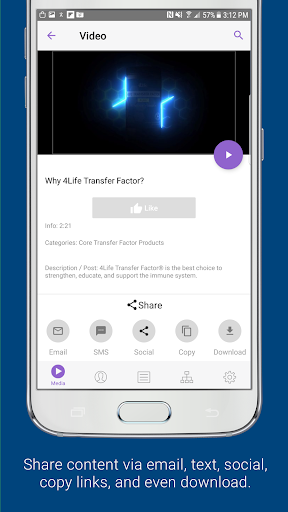 Media: It has never been easier to share information about your products and opportunity via SMS text, email, or social media. Simply choose from the library of content and digital tools specifically designed to promote your business and share them with a contact. You'll even receive a notification when they view the tools so you know exactly when to follow up! No data connection? No problem! Simply download content in the app beforehand for offline playback.
