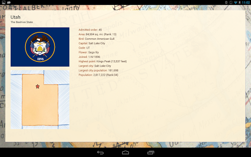 For each state you will also learn the population, flag, largest city, motto, state bird, area and highest point! Test yourself with quiz mode. The clickable map makes it easy to lookup a state.