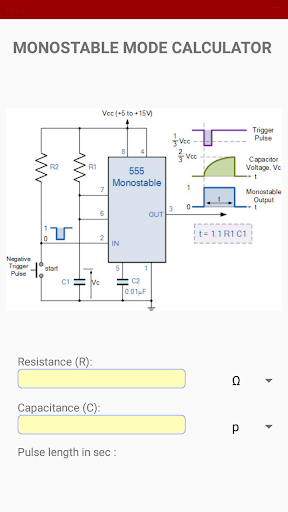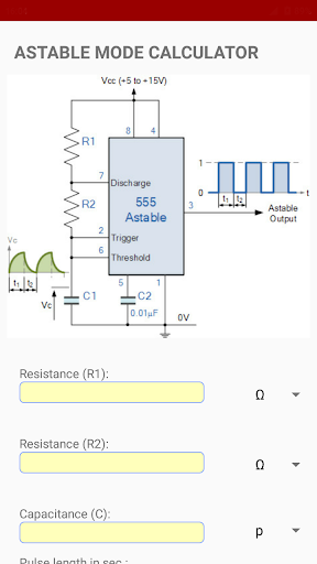 circuit diagram and description. It contains 2 calculator to calculate Astable and Monostable mode of 555 timer IC with brief description, circuit diagram and equations you needed. in this app you can download or bookmark your favourite projects. This app is best choice for hobbyist, students, circuit lovers who want to explore the world of electronics.