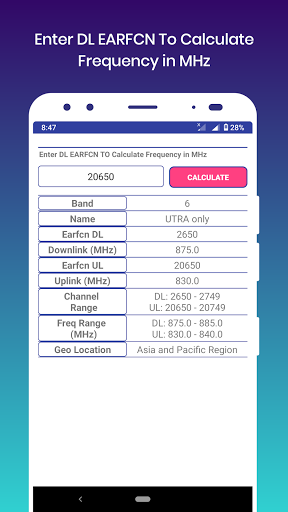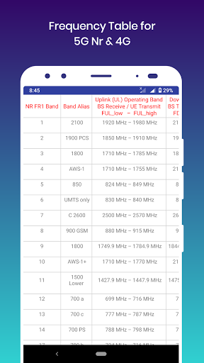 This app also provide the information about the frequency bands details approved by 3GPP with frequency range, duplex Mode and allowed bandwidth.