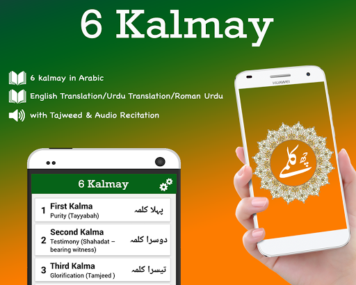 All six kalma of islam are in Arabic with correct pronunciation (Tajweed) given in English and Urdu translation comprising: