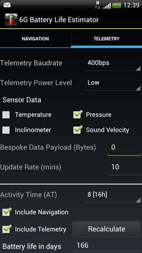Bug fix: The indexing of the update rate was incorrect above 20s due to the 30s option being removed from the drop down list but not the lookup table. Therefore battery life estimates will be pessimistic above 20s. Hence 60s was actually using 30s and 10mins was using 60s and so on.
