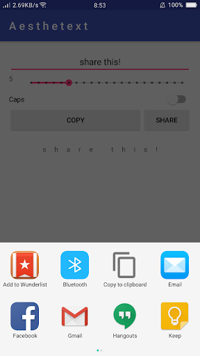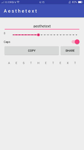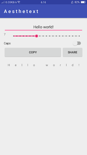 This simple app makes spacing out letters a breeze! Just enter you text and use the simple slider to evenly space out your letters. When you have found the perfect spacing, use the copy button to copy the text to your clipboard or use the share button to instantly share to other apps!